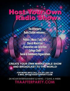 Slots are still available at the best damn online internet radio station in the world, Tha Afterparty Radio. Why not host your very own show on the station made for the people, by the people? We have availability on the Party South’s A and B sides and The Party West. Best of all, your show means your own show with your own voice and platform. Whether you are a seasoned radio vet or new to the game, Tha Afterparty Radio is the perfect station for you to get your show out to a global audience, 24/7.