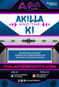 Tha Afterparty Radio is pleased to welcome the latest addition to The Party South’s A Side. “Akilla and the Ki” is the show where nothing is left off the table because “we talk about everything.” Tune in to hear the latest happening in “entertainment, celebrity gossip and real issues in the black community” Mondays, 8-9 pm CST.