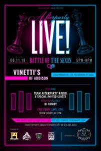 The main event will be held at Vinetti’s in Addison, featuring Team Afterparty Radio, plus special invited guests. DJ Curdy will be there on the 1’s and 2’s. There will be free entry until 6 p.m., so get there early. Also, enjoy a complimentary buffet until the food runs out. Showtime is at 7 p.m., so be sure to clear your schedule for the chance to participate in the no judgment zone dialogue where all viewpoints, opinions and statements are welcome. See ya at the party!