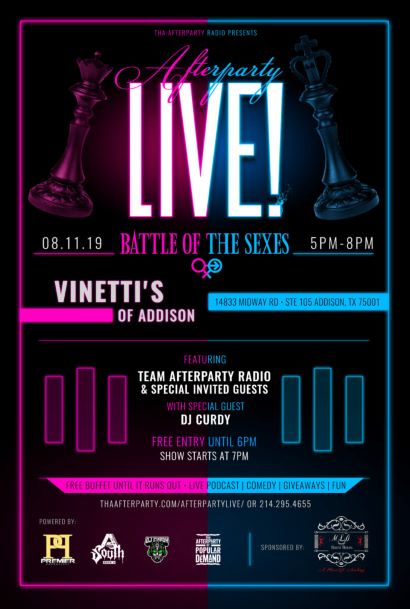Join Tha Afterparty Radio for an in-depth convo this Sunday as the Afterparty Live! series continues. On August 11, attendees will get thrown into “Battle of Sexes,” so be prepared to battle as this discussion is likely to go 0 to 100 real fast! The main event will be held at Vinetti’s in Addison, featuring […]