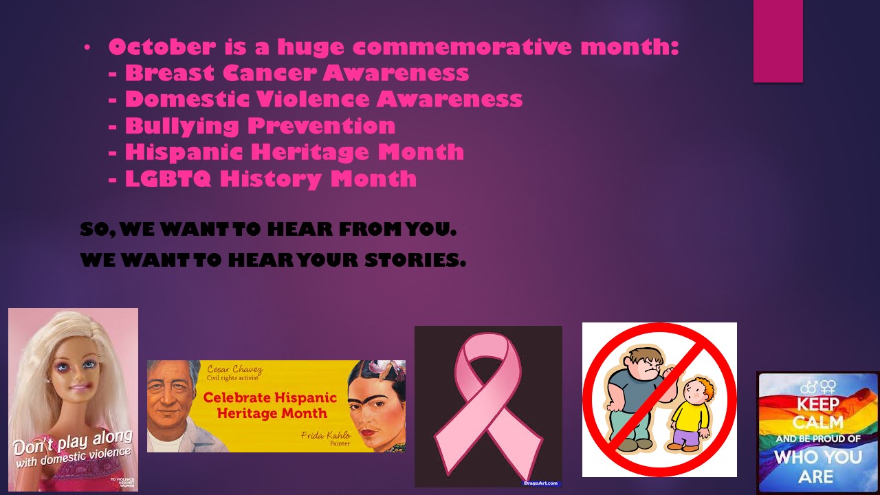 Let us know how you overcame breast cancer, domestic violence or bullying. Show us your Hispanic Pride and share your personal LGBTQ history.