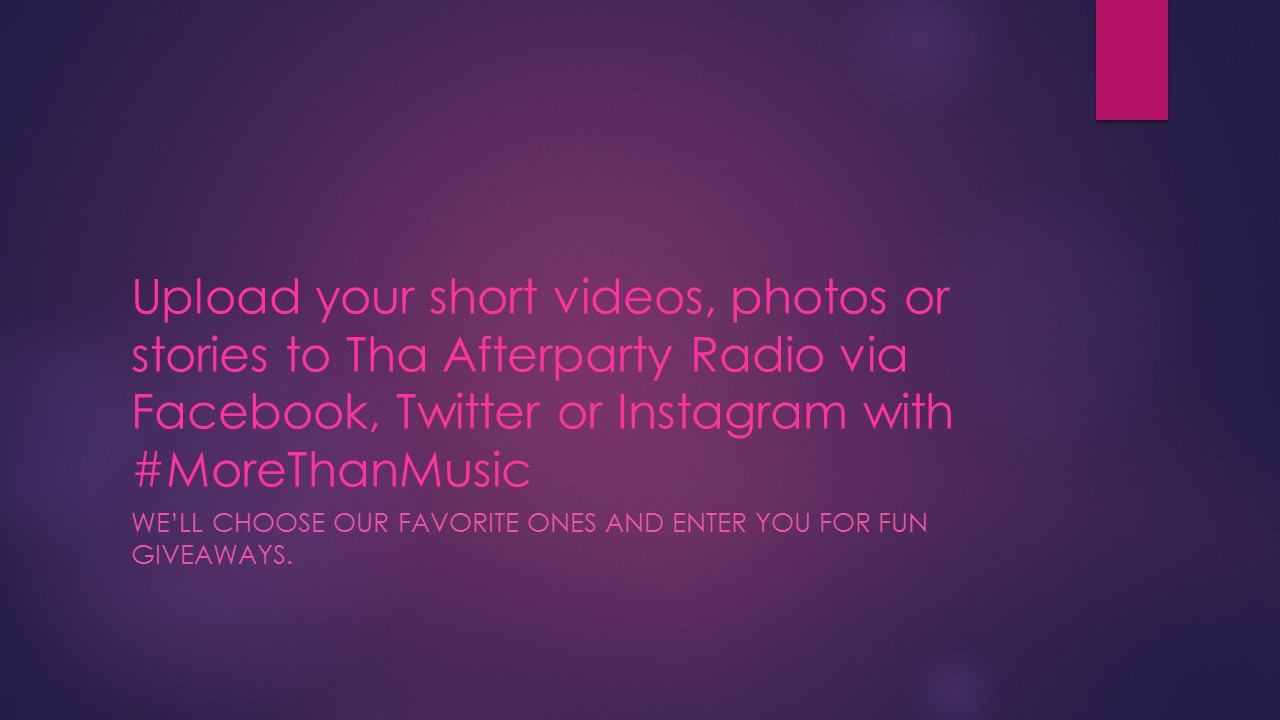 Tha Afterparty Radio wants to hear your story. Share your short videos, photos or stories with Tha Afterparty Radio via Facebook, Twitter or Instagram and include #MoreThanMusic.