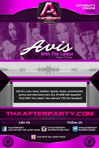 Tha Afterparty Radio is pleased to announce the latest additions to its all-star lineup. Added to the roster is “Avis with the Latest,” a unique hybrid radio/TV show. Avis will bring listeners all the latest “news, weather, sports, music, commercials, promo and interviews all-in-one.” Get the latest to stay in the know every Saturday 12-2 pm CST on the A Side.
