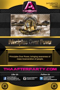 Tha Afterparty Radio is pleased to announce the latest addition to its all-star lineup. The latest show to hit the airwaves is “Principles Over Power.” The show explores, “power over principles, bringing awareness of mass incarceration of people.” The show airs each Saturday 12-2 pm CST on the A Side.